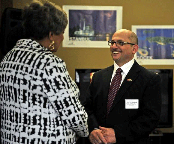 Alp Levent, executive director of Turkish American Chamber of Commerce of the Southeast Tennessee, right, talks with Dr. Millicent Gray Lownes-Jackson at the grand opening of the Turkish American Chamber of Commerce's Nashville office., Jae S. Lee, The Tennessean